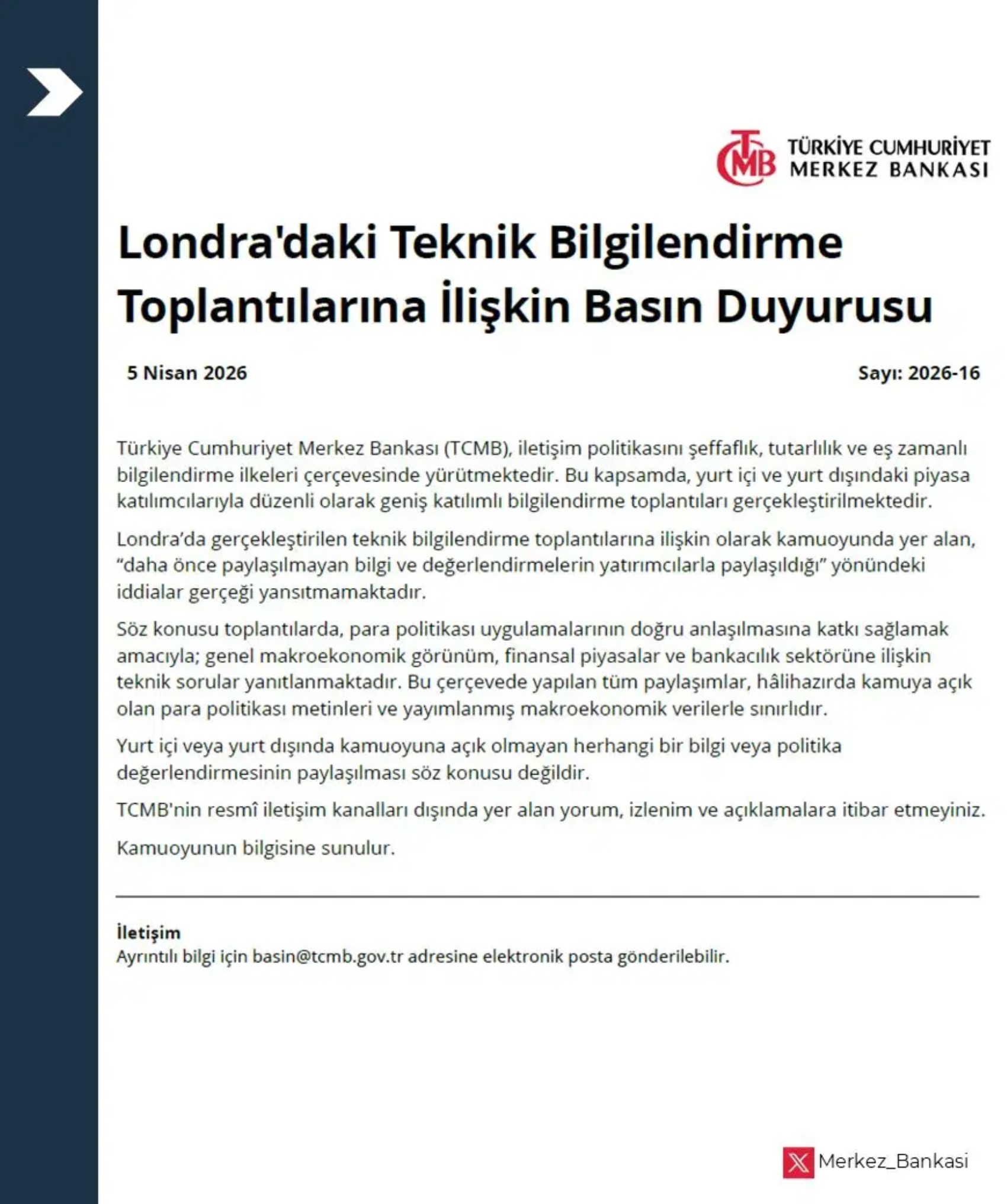 Türkiye Cumhuriyet Merkez Bankası da konuya ilişkin yaptığı açıklamada, iletişim politikasının şeffaflık, tutarlılık ve eş zamanlı bilgilendirme ilkeleri doğrultusunda yürütüldüğünü belirtti. Bu kapsamda, yurt içi ve yurt dışındaki piyasa aktörleriyle düzenli ve geniş katılımlı toplantılar gerçekleştirildiği ifade edildi.